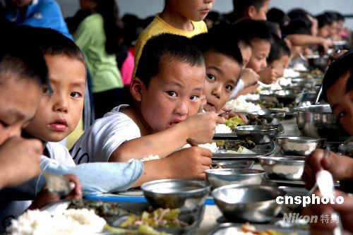 9月1日,四川阿壩州汶川地震災區的600余名學生在瀘州市第十中學校經過兩周的環境適應后,正式進入過渡復課,圖為孩子們正在集體用餐,三菜一湯,吃得津津有味。中新社發 牟科 攝