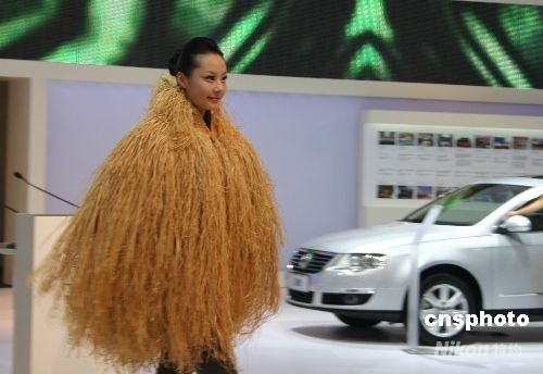 第11屆成都國(guó)際車展向媒體開(kāi)放,一美女車模著“稻草”裝現(xiàn)身。 中新社發(fā) 霍潺 攝