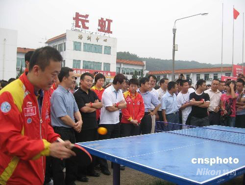 9月20日,中國體育總局乒羽中心主任劉鳳巖、男乒主教練劉國梁、女乒主教練施之皓、隊員張怡寧、馬琳、王皓、王勵勤等一行15人帶著奧運金牌、榮譽、喜悅和祝福,前往四川綿陽長虹培訓中心看望慰問在汶川大地震中遭受重創的北川中學學生。圖為馬琳等隊員與學生們切磋球技。中新社發 肖青 攝