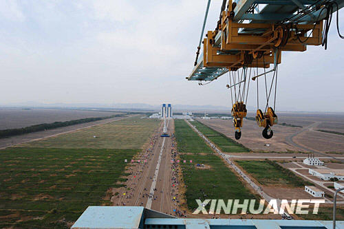 這是轉(zhuǎn)運(yùn)現(xiàn)場。 9月20日15時(shí)15分,神七載人飛船、長征二號F運(yùn)載火箭和逃逸塔組合體,順利垂直轉(zhuǎn)運(yùn)至發(fā)射區(qū),標(biāo)志著神七任務(wù)已進(jìn)入最后的發(fā)射準(zhǔn)備階段。 新華社記者 李剛 攝