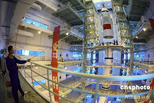 備受矚目的神舟七號載人航天飛行任務實施在即,目前,飛船、火箭、逃逸塔已在酒泉衛星發射中心總裝測試廠房順利完成對接。中新社發 楊志遠 攝
