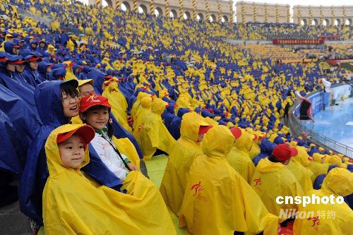 9月23日上午,寧夏回族自治區成立50周年慶祝大會在銀川市覽山景觀劇場舉行,民眾穿著雨衣參加大會。中新社發 廖攀 攝