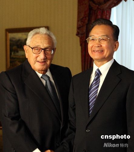 中國(guó)總理溫家寶23日在紐約會(huì)見(jiàn)美國(guó)前國(guó)務(wù)卿基辛格。中新社發(fā) 李靜 攝