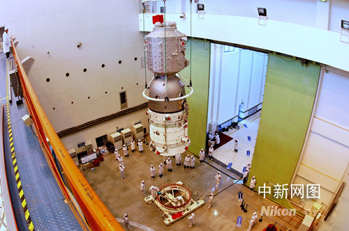 中國神舟七號載人航天飛船發射在即。圖為神舟七號飛船起吊(資料圖片)。袁明月 攝