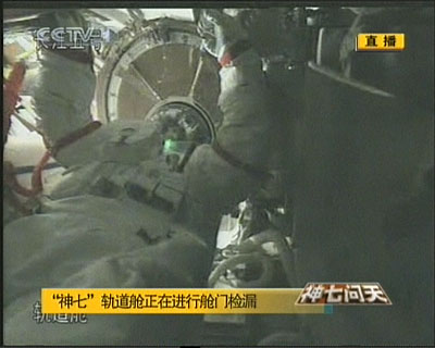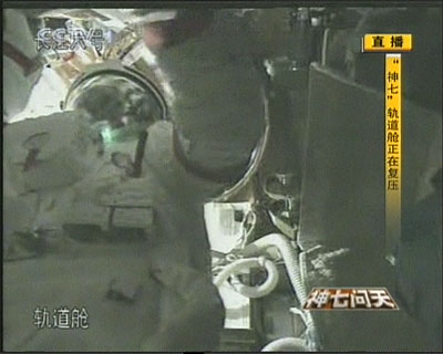 9月27日,“神七”航天員翟志剛完成出艙活動后,回到軌道艙并對軌道艙進行艙門檢漏后復壓。