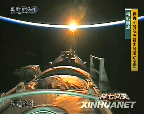 9月27日,神舟七號艙外的攝像機拍攝到的太空日落的壯觀景象,金色的太陽給地球和神舟七號鑲上了金邊,景色分外美麗。新華社發(電視截圖)