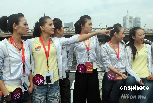 9月27日,正在天津參加“2008東麗湖世界最佳模特大賽(best model of the world)中國區(qū)總決賽”的50名男女選手,乘游船游覽天津市區(qū)新貌,海河風光。中新社發(fā) 錢興強 攝
