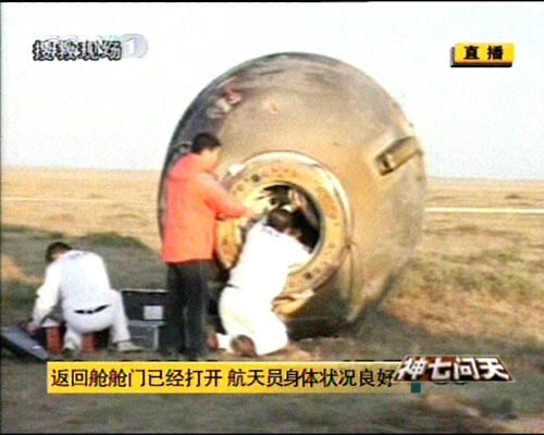 神舟七號飛船返回艙順利著陸,返回艙外觀檢查正常,搜救隊員按程序打開返回艙艙門,醫監醫保人員檢查航天員身體狀況。經醫監醫保人員檢查,三名航天員身體狀況良好。三人面帶笑容。