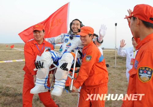 9月28日,神七航天員出艙。這是翟志剛自主出艙后,被搜救人員抬走。 新華社記者李剛攝