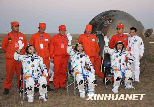 9月28日,神七航天員出艙后揮手致意。新華社記者王建民攝