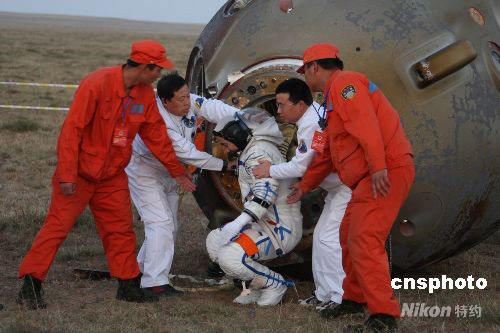 9月28日晚,神七返回艙成功著陸,航天員依次出艙。中新社發 張雷 攝