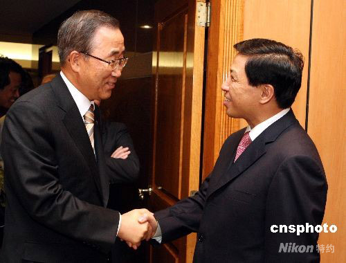 中國常駐聯合國代表團29日晚舉辦中國國慶59周年招待會,聯合國秘書長潘基文出席。圖為中國新任常駐聯合國代表張業遂歡迎潘基文出席招待會。中新社發 李靜 攝