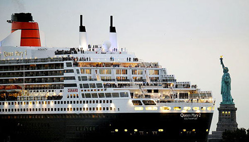 10月16日,巨型郵輪“瑪麗女王二號”從美國紐約哈得孫河口的自由女神像前駛過。