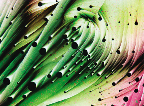 間苯二酚、亞甲基藍、硫磺的結晶混合物,約翰·哈特攝,放大13倍。拍攝地點:美國科羅拉多州伯爾德。所用技術:透射偏振光。