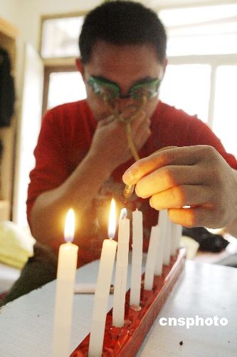 10月21日,開封民間藝人凌春江用眼睛將蠟燭吹滅。他戴上特制的眼鏡,從兩眼中聚氣到一根管子內(nèi),一分鐘吹滅一排蠟燭。如今,身懷絕技的凌春江被中華民間絕技藝術(shù)團(tuán)聘為特邀演員,經(jīng)常到全國各地巡演。中新社發(fā) 慎重 攝