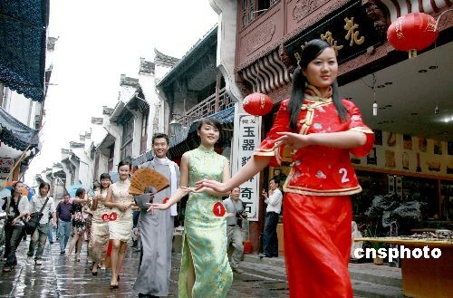 2008年10月22日,黃山魅力青年在屯溪老街舉行風情模特秀。安徽黃山市為提升城市品位,充分展示黃山青年的良好形象,黃山魅力青年首次在千年古鎮的屯溪老街舉行風情模特秀。魅力青年模特在古色古香、徽風遺韻的屯溪老街“秀”出了風情萬種、人與自然和諧共存的美好景象。中新社發 方也廣德 攝