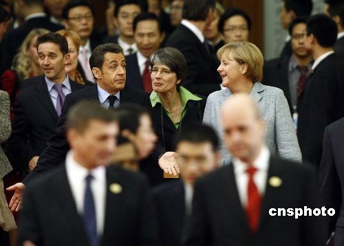 法國總統薩科奇與德國總理默克爾出席會議。中新社發 盛佳鵬 攝
