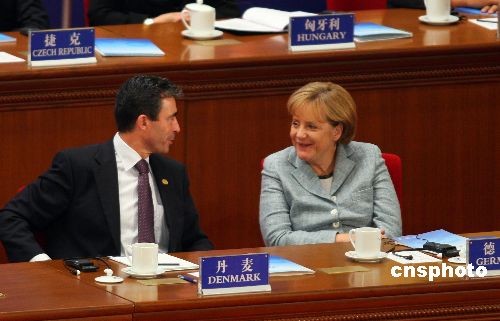 德國總理默克爾與丹麥首相拉斯穆森在開幕式上相談甚歡。中新社發 廖文靜 攝