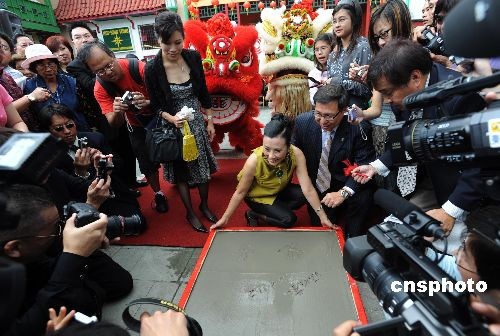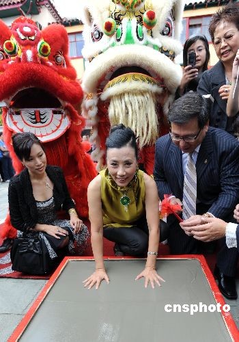 十一月二日,香港著名演藝明星汪明荃來(lái)到洛杉磯中國(guó)城,在中央廣場(chǎng)留下手印。主辦該活動(dòng)的羅省中華總商會(huì)會(huì)長(zhǎng)莊佩源稱贊汪明荃為傳播中華文化作出重要貢獻(xiàn),是所有華人的驕傲。香港明星周潤(rùn)發(fā)與曾志偉等已在中國(guó)城中央廣場(chǎng)內(nèi)留下手印和簽名,羅省中華總商會(huì)表示,他們會(huì)繼續(xù)邀請(qǐng)為華人爭(zhēng)光的知名人士來(lái)此留手印,希望這里成為洛杉磯的第二個(gè)星光大道。中新社發(fā) 張煒 攝