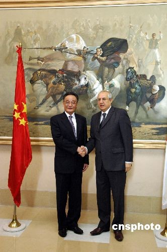 正在阿爾及利亞進行正式訪問的中國全國人大常委會委員長吳邦國,當地時間四日上午在國民議會大廈與阿爾及利亞國民議會議長齊亞里舉行會談。圖為雙方在會談前握手。中新社發 孫宇挺 攝