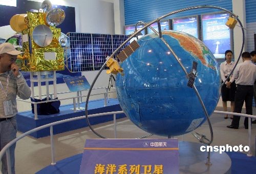 圖為中國航天科技集團公司研制的海洋系列衛星在珠海航展展出,左上為海洋二號衛星模型。中新社發 孫自法 攝