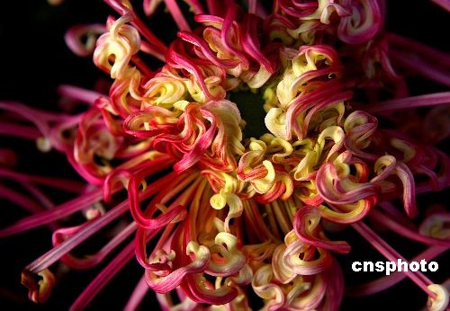 在11月上旬的河南省開封市第二十六屆菊花節上,盆盆競相怒放,朵朵爭奇斗艷。 菊花花會是開封市政府主辦的融觀花賞菊和展示宋都民俗文化為一體的盛大旅游文化活動,每到金秋時節,古城公園景點、大街小巷到處都是菊的世界,花的海洋。期間,龍亭、鐵塔、大相國寺、包公祠、禹王臺五大展區展花40余萬盆,200多個品種,菊花造型千姿百態,令人目不暇接。中新社發 宋吉河 攝