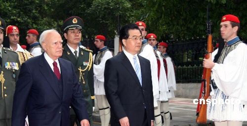 希臘總統帕普利亞斯二十四日下午在總統府舉行儀式,歡迎中國國家主席胡錦濤訪問希臘。圖為胡錦濤在帕普利亞斯陪同下檢閱希臘國家儀仗隊。中新社發 吳衛中 攝