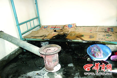 宿舍里放著一個爐子,煙囪在距地面30厘米處,爐子東邊床鋪下就堆放著煤塊,床板已被點燃,被子也被燒了,幾雙鞋子也沒來得及穿上,散落在宿舍里。