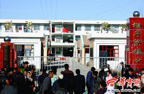 家長(zhǎng)們?cè)诙炎恿烘?zhèn)中學(xué)外