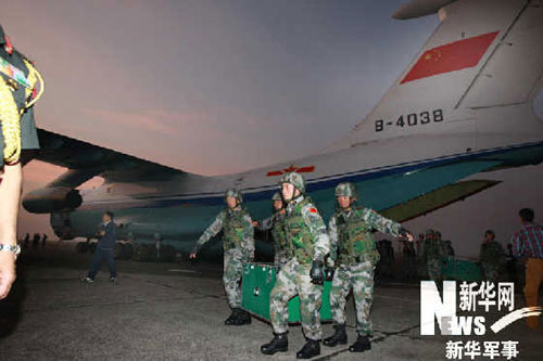 中方參訓(xùn)官兵抵達(dá)印度后從運(yùn)輸機(jī)卸下物資。新華軍事記者 李剛 攝