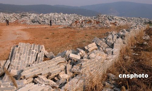 12月17日上午,備受社會關注的河南洛陽龍門石窟西山違法別墅群被當地政府強制拆除。圖為當日拆除后的廢墟。中新社發 張曉理 攝