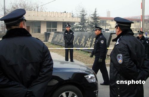 12月26日起,震驚全國的三鹿奶粉案在河北陸續開庭審理。當日上午,石家莊市中級人民法院開庭公開審理張玉軍、張彥章非法制售三聚氰胺案。 三鹿奶粉事件發生后,張玉軍、張彥章被石家莊市人民檢察院“以危險方法危害公共安全”罪提起公訴。圖為警方在法院門口拉起警戒線。