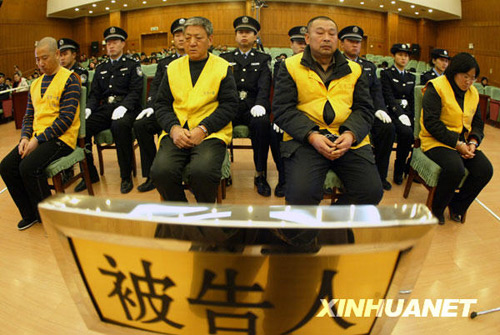 12月29日,三鹿問題奶粉系列刑事案件被告人高俊杰、薛建忠、張彥軍、肖玉(從左至右)在石家莊市中級(jí)人民法院法庭上受審。新華社發(fā) 丁立新 攝