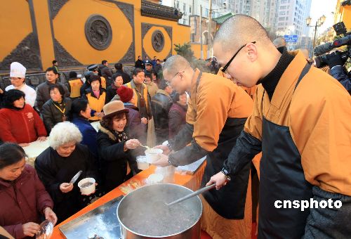 1月3日,適逢中國農歷十二月初八傳統的“臘八節”,上海佛教界向民眾首次施贈臘八粥。圖為一大早,數千市民在百年古剎玉佛禪寺山門前排起長隊,等候品嘗熱氣騰騰的臘八粥,祈福來年國泰民安。