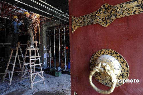 一月初,西藏拉薩布達拉宮珍寶館內施工人員正在緊張的施工建設,該工程將于四月中旬竣工。中新社發 廖攀 攝