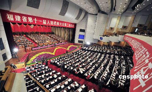 一月十日,福建省第十一屆人民代表大會第二次會議在福州開幕。福建省省長黃小晶在會上作政府工作報告時指出,二00九年福建將積極擴大“三通”效應(yīng),提升閩臺經(jīng)貿(mào)合作水平,促進閩臺文化交流雙向互動。中新社發(fā) 劉可耕 攝