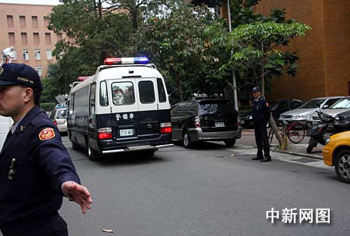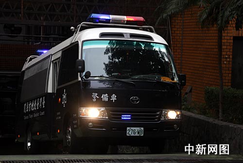 1月19日,臺北地方法院首次開庭審理前臺灣地區領導人陳水扁家弊案。傳訊陳水扁到地院準備程序庭。圖為下午庭審結束,警備車押著陳水扁離開臺北地院鐵門,返回臺北土城看守所場景。作者:陳立宇