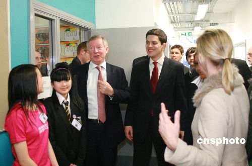 當地時間22日下午,英國外交大臣米利班德在曼徹斯特發布英國政府首個對華關系框架性文件后,與英超曼聯俱樂部主教練弗格森爵士一起來到斯達芒頓中學,了解該校師生去年訪華的體會。圖為米利班德(左四)和弗格森(左三)與該校的華裔學生在一起。中新社發 李鵬 攝