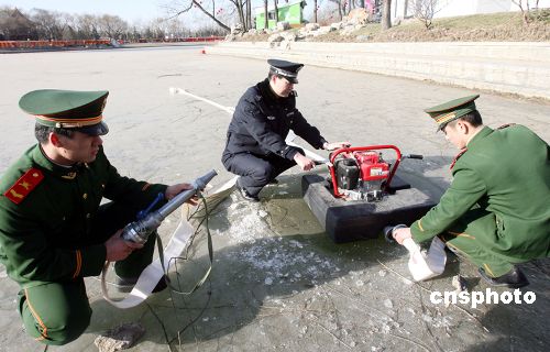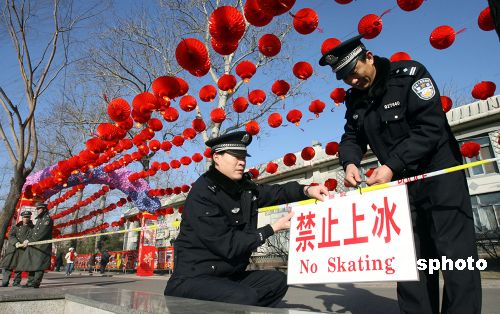 1月22日,北京崇文警方會同相關部門對龍潭湖廟會的各項公眾措施進行最后檢查,以確保游人的絕對安全。中新社發 胡建強 攝
