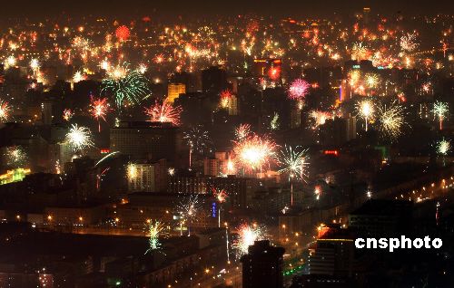 1月26日零時,北京在絢麗的煙花映襯下成為一片歡樂的海洋。中新社發 杜洋 攝