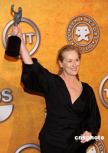 號稱奧斯卡主要風向標的第十五屆美國演員工會獎(SAG)一月二十五日晚在洛杉磯揭曉。美國老牌影星梅麗·史翠普(又譯梅麗爾·斯特里普)憑借《虐童疑云》(Doubt)奪得電影類劇情片最佳女主角獎。梅麗·史翠普剛剛獲得奧斯卡最佳女主角提名,從而以十五次入圍奧斯卡締造了歷史紀錄。中新社發(fā) 張煒 攝
