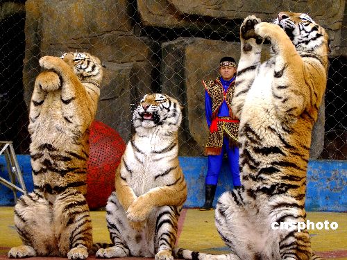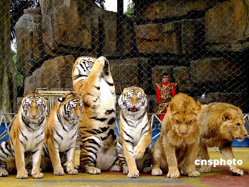 2009年1月29日,廣西南寧動(dòng)物園的老虎獅子在馴獸員的引導(dǎo)下,直立起來,為游人作揖。還集體排隊(duì)走大圈,寓意祝游人“行大運(yùn)”。