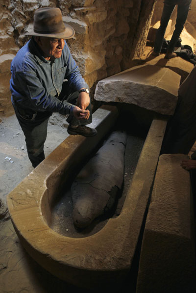 2月11日,在位于塞加拉地區著名的階梯金字塔西南的墓地中,埃及最高文物委員會主席扎!す咚勾蜷_了一具新發現的古埃及石棺,并從中找到一具保存完好的木乃伊。