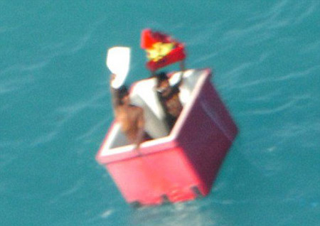 08年12月23日,兩個緬甸漁民的漁船在澳洲北部海岸外翻覆,船上20人落海。他們兩人擠進面積只有一張小桌子大的冰桶里,在鯊魚出沒的海上漂流了25天,才被澳洲海岸巡防隊的飛機發現。