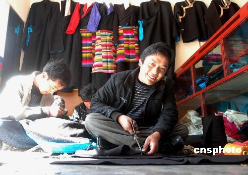 2月20日下午,在充滿節日氣氛的拉薩江蘇路“藏族傳統山南杰德秀郎布和西瑪服裝訂做室”,專做藏民族傳統服裝的幾個小伙子在制作漂亮的藏裝。一位叫邊巴次仁的青年表示,藏歷新年就要到了,藏民族新服裝賣得很俏,現在平均每天能銷售近十套,大家天天忙得加班。中新社發 周波 攝