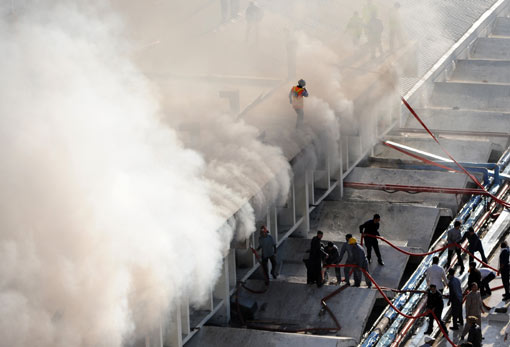 2月26日,位于巴基斯坦首都伊斯蘭堡的萬豪酒店發生火災,造成4人受傷。圖為消防人員正在滅火。