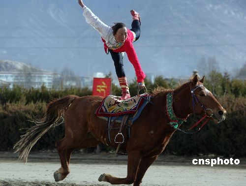 2月27日,拉薩賽馬場上演一年一度的傳統(tǒng)賽馬表演,西藏馬術(shù)隊的女騎手精湛的技藝博得了場內(nèi)觀眾的陣陣喝彩。中新社發(fā) 劉震 攝
