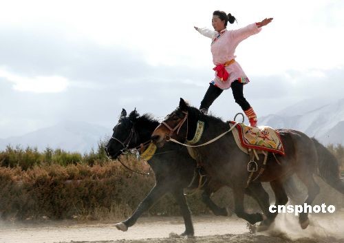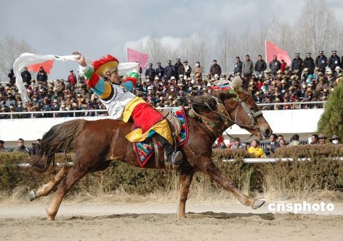 2月27日,中國藏歷年初三,在拉薩市北郊的賽馬場,傳統賽馬與馬術表演活動隆重舉行,身懷絕技的騎手們為成千上萬的觀眾表演了精彩絕倫各種節目。中新社發 周波 攝
