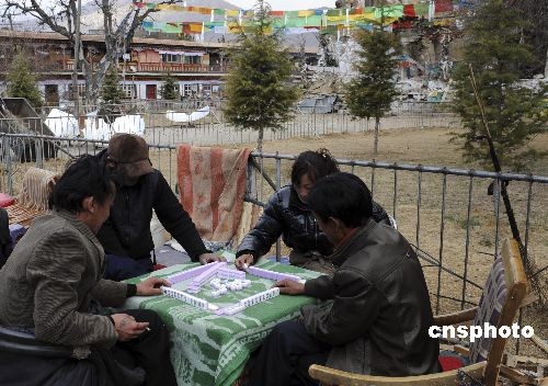 2月28日,拉薩市東城策門林藏民聚居區,社區居民搭起桌子在室外打麻將休閑。中新社發 廖攀 攝