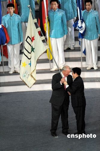 哈爾濱市市長張效廉把大冬會會旗交給國際大體聯主席喬治·基里安。